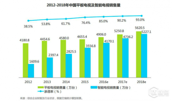 根据艾瑞的《2016年中国互联网电视研究报告》的数据,虽然智能电视销售增长率2013年爆发后趋稳,但是在平板电视销量中的占比却越来越高,预期2016年将占整个电视市场销量的85%以上,而到2018年将达93%以上,年销售量将超过5200万台,总保有量超过2亿台: